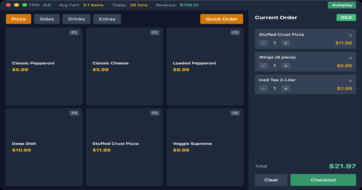 Separate cashier and customer windows with real-time synchronization, simulating production POS hardware.